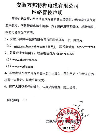 鄭重聲明:安徽萬邦特種電纜有限公司官方網站為:www_wanbangcable_com.siyunxi.com,除此之外無任何子網站或合作網站,其余均為假冒偽劣。電話:0550-7621728 13485756353 地 址:安徽省天長市滁州高新技術產業開發區經四路29號